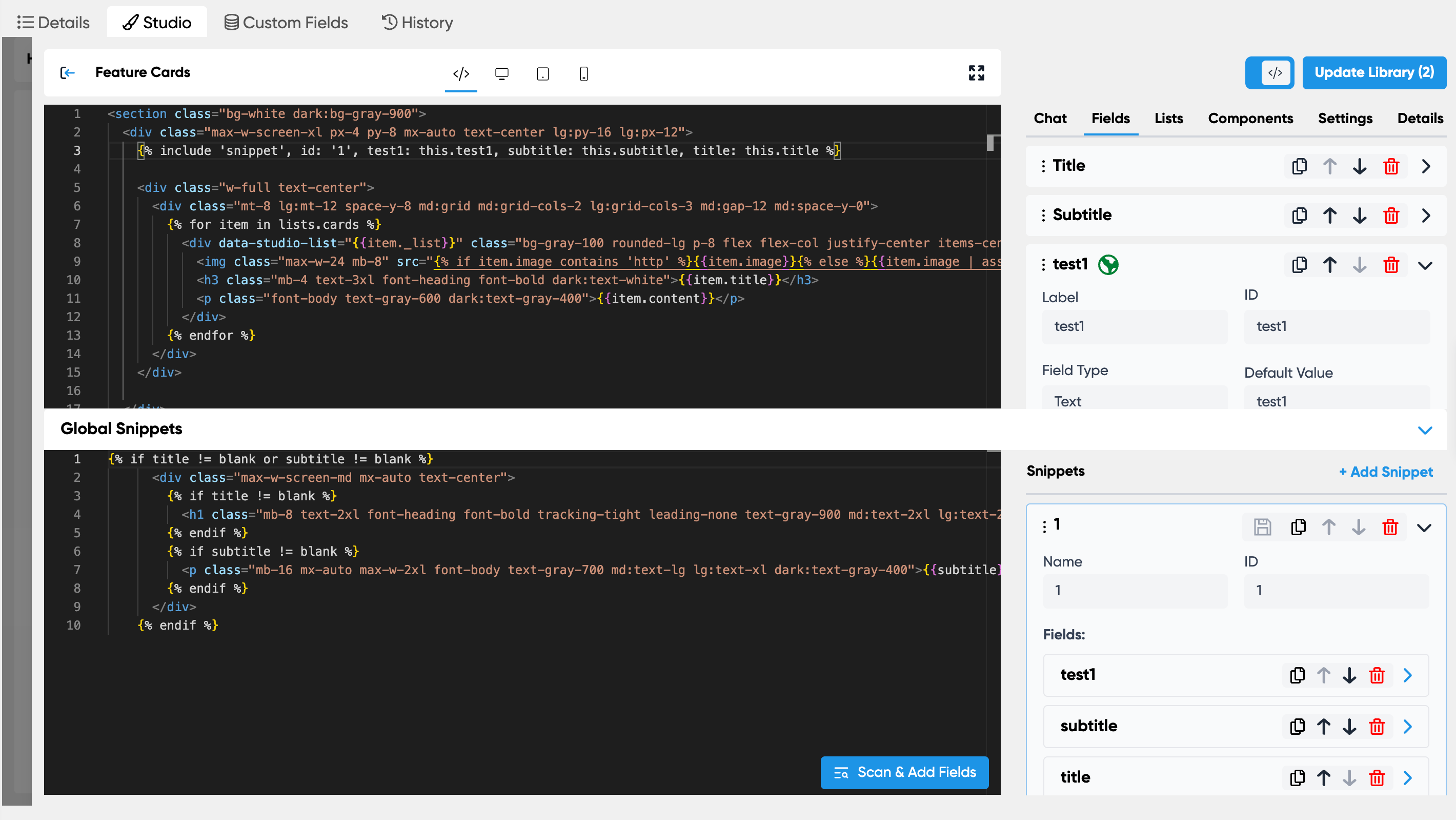We have been working on some big new features for Studio that will help Theme developers and anyone build sections have far more control over reusable code while keeping everything simple and easy to use from an editor’s perspective; introducing Global Fields and Global Snippets.